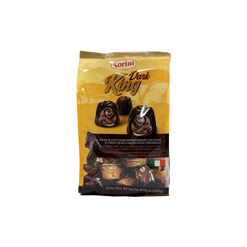 70% Dark chocolate pralines filled with cocoa cream and cocoa bean pieces with sugar coating.