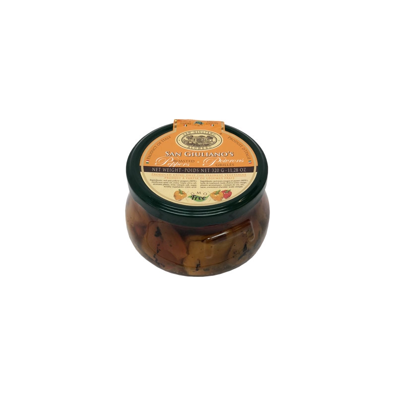 Poivrons rouges et jaunes rôtis de San Giuliano est une entrée italienne traditionnelle faite avec une sélection de seulement les meilleurs poivrons frais si riches en vitamines et antioxydants. Pelés et rôtis avec soin, ils sont marinés avec des herbes et de l'huile. Leur goût ravira votre palais.